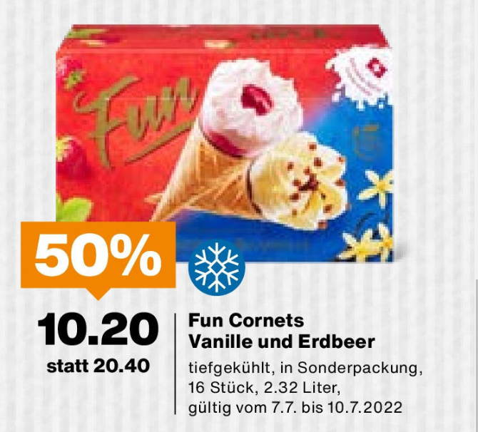Die beliebten Cornets von der Marke Fun mit Vanille und Erdbeer Geschmack sind von 7.7 bis 10.7 in der Migros zum halben Preis erhältlich.
