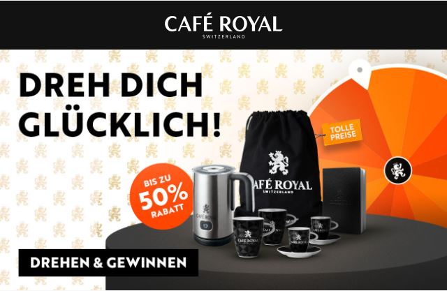 Bei Café Royal gibt es aktuell einen Wettbewerb, wo man am Glücksrad dreht und einen Preis in Form von Gutscheinen / Rabatte und Artikel gewinnen kann.