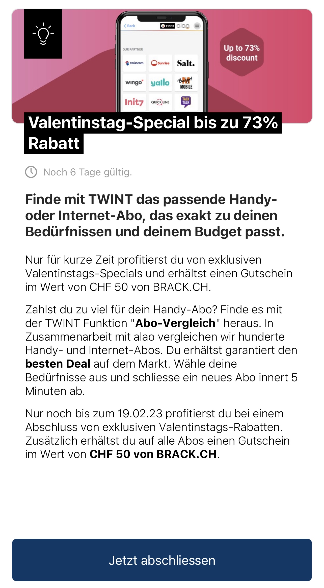 In der Twint App gibt es einen Link zu Alao bei dem man einen 50.- Brack Gutschein extra erhält wenn man ein neues Abo abschliesst.