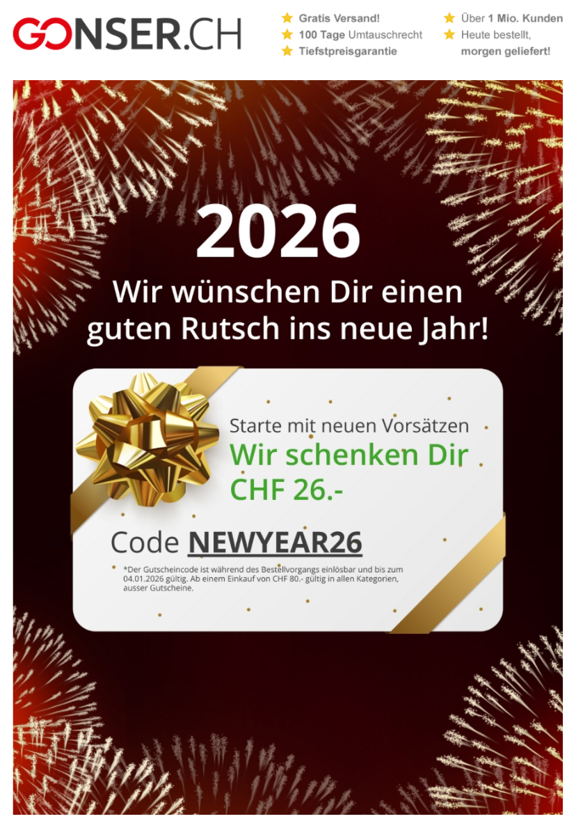 Avec le bon NEWYEAR26, vous pouvez économiser jusqu’au 04.01.2026, 26.- à partir de 80.-.