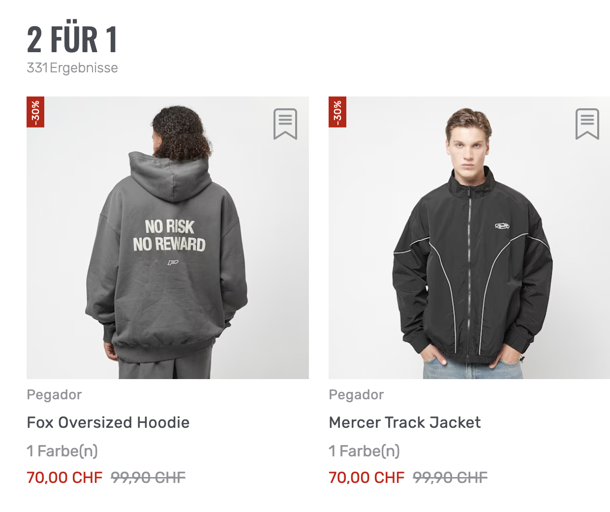Bei Snipes gibt es auf Ausgewählte Artikel die Atkion 2 für 1. Nimm 2 zahle 1! Im Warenkorb wird hier aber letztendlich 50% bei dem ausgewählten Artikel abgezogen.