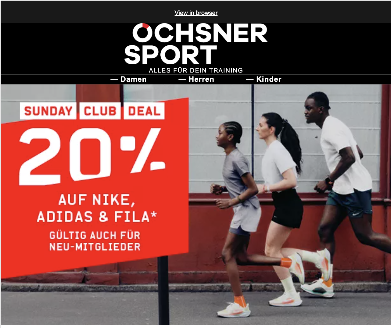 Heute gibt es bei Ochsner Sport 20% AUF NIKE, ADIDAS & FILA.