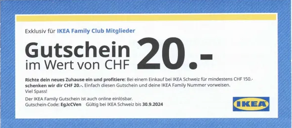 Als IKEA Family Club Mitglied erhält man bei einem Einkauf für mindestens 150.- Franken einen Rabatt von 20.- Franken.