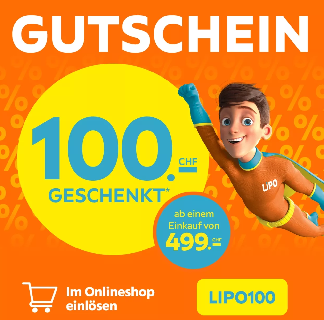 Bei LIPO erhaltet ihr derzeit CHF 100 Rabatt ab CHF 499 Bestellwert mit dem eingeben des Gutscheincodes. Der Gutschein gilt bis 01.11.2023.