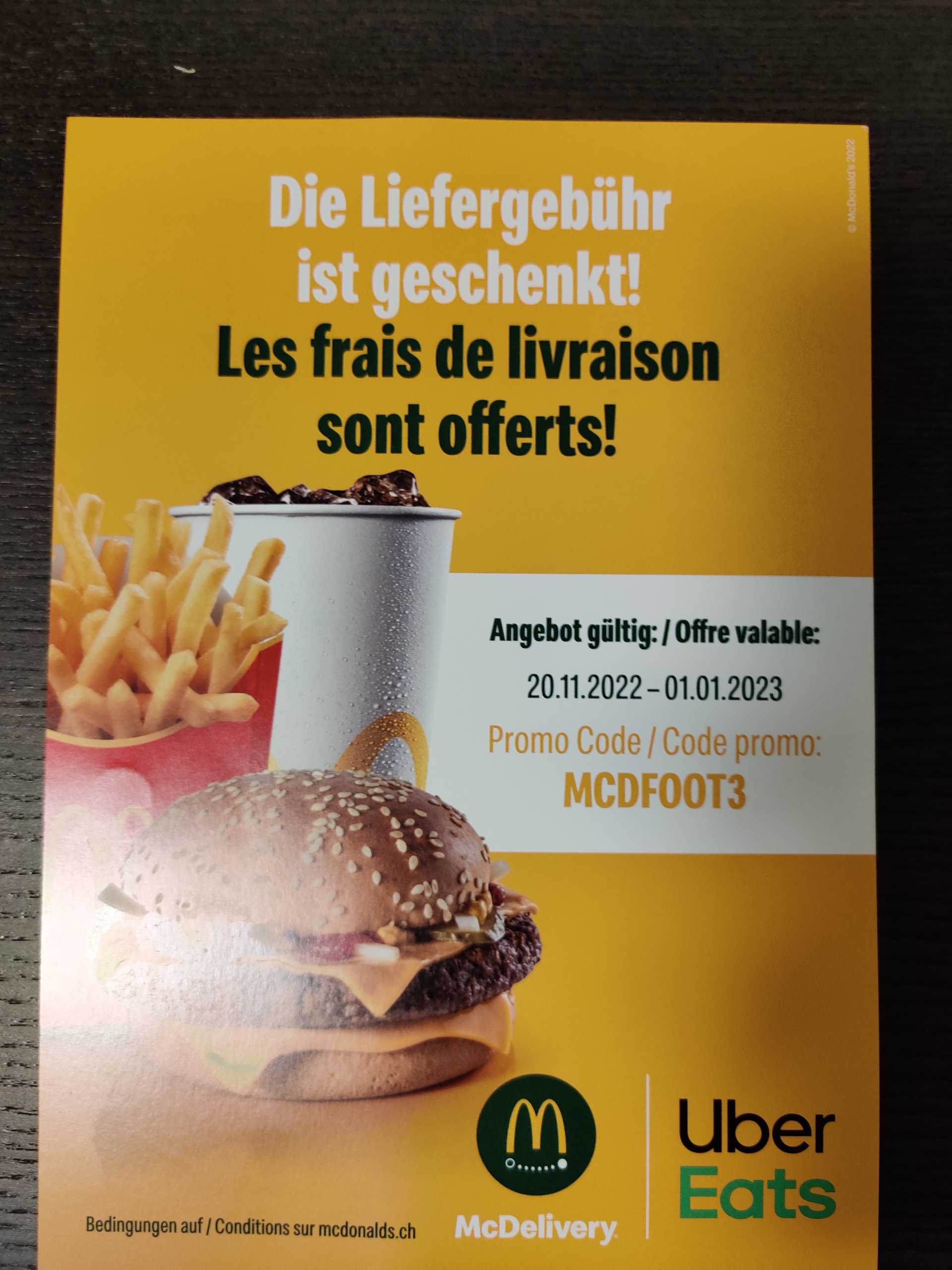 Gerade diesen Flyer für Gratis Lieferung bei UberEats für McDonalds erhalten (MBW 30.-). Scheint Konto unabhängiger Code zu sein.