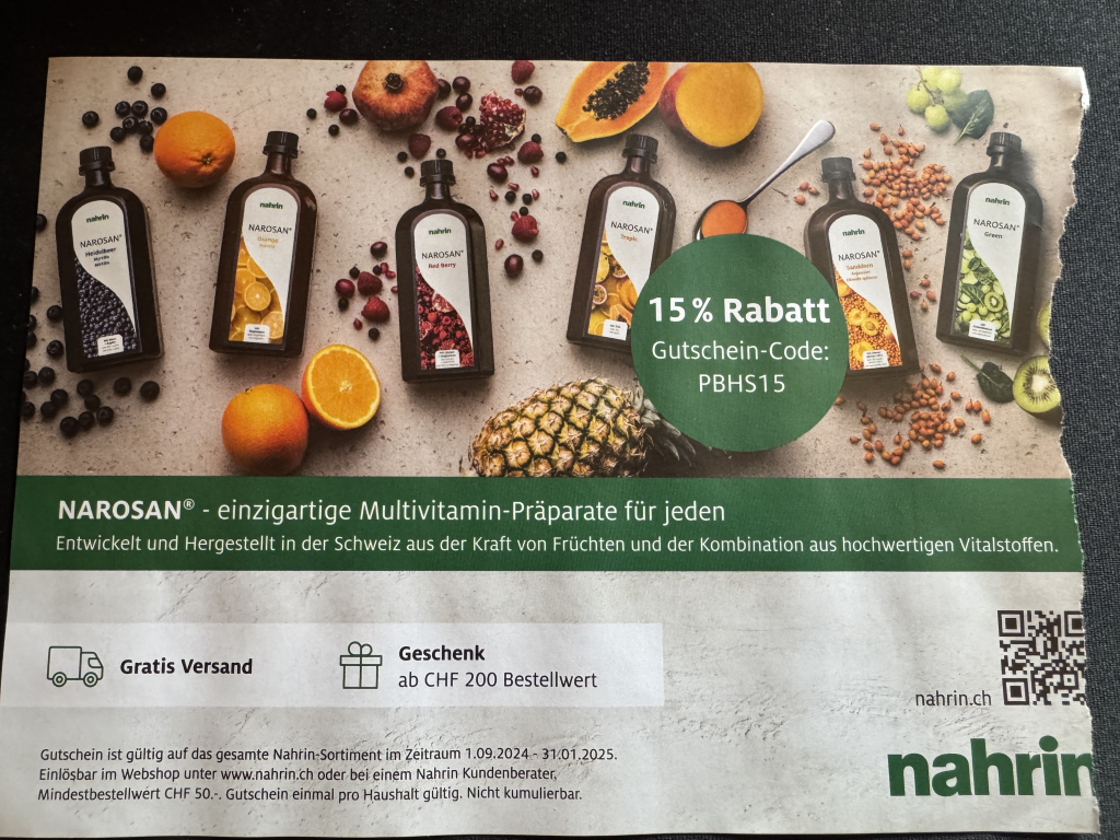 Es gibt bei Nahrin 15% Rabatt auf das gesamte Sortiment ab einem Bestellwert von CHF 50.