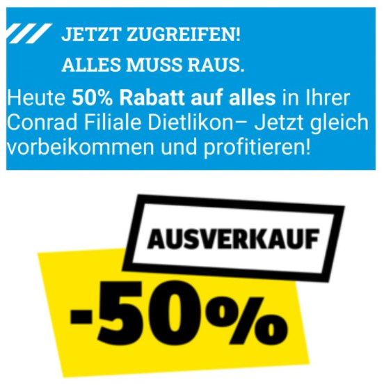 Mick hat den neuen Beitrag 50% auf alles im Conrad Dietlikon (OFFLINE, nur was vor Ort ist) geschrieben vor 4 Jahren, 3 Monaten