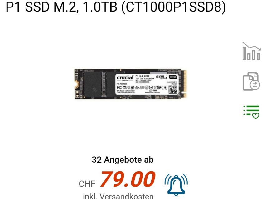 Crucial P1 1 TB bei Digitec für CHF 79.- bisheriger Toppreis.