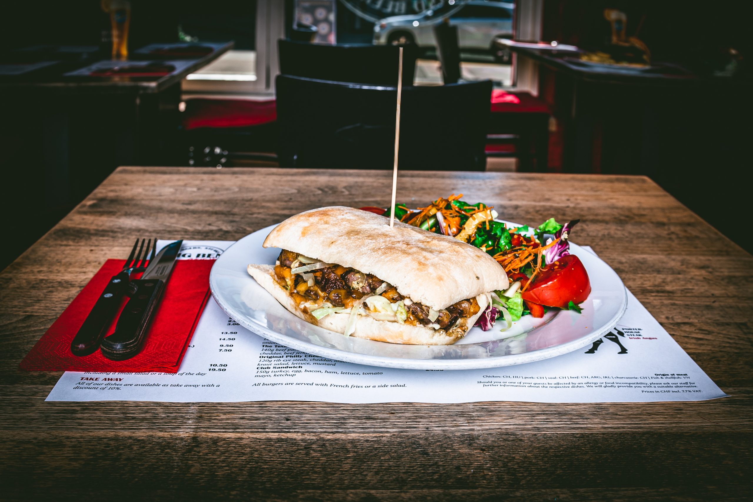 Das BESTE Cheesesteak Sandwich ausserhalb Philadelphias! 120g Rib Eye Steak mit Cheddar, Zwiebeln, Krautsalat, Salat und Senf und dazu natürlich noch eine Portion Pommes oder einen Salat.