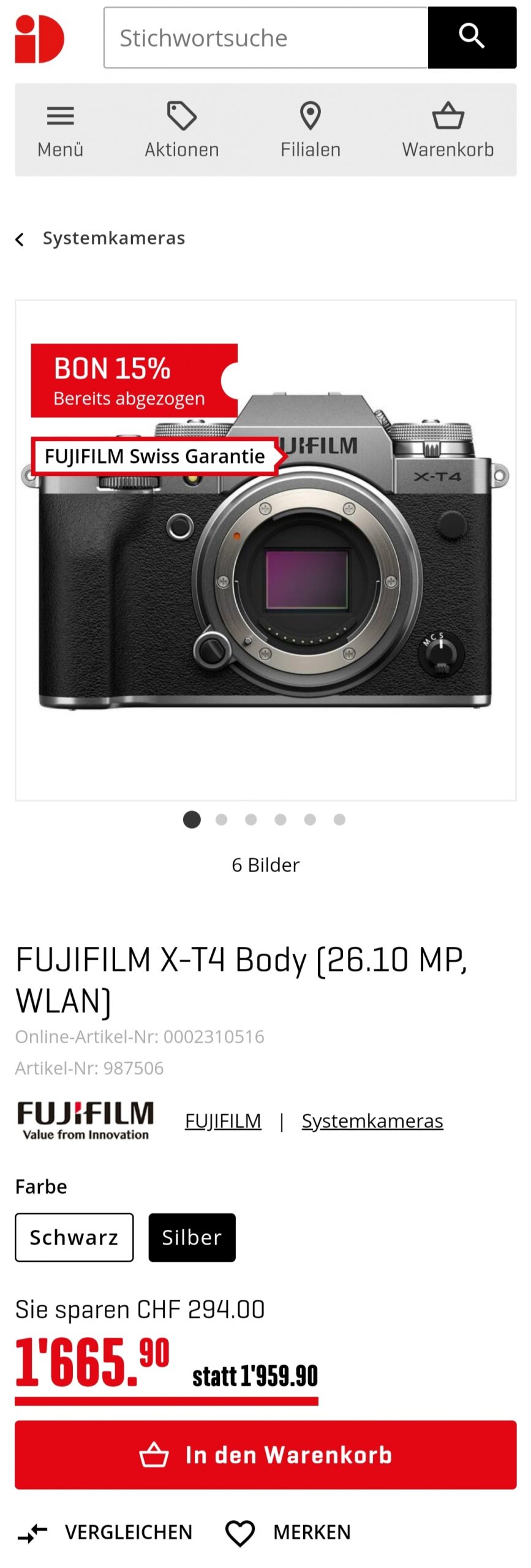 Die Fujifilm X-T4 in der Farbe Silber gibt es heute bei Interdiscount für starke 1665.90, in schwarz für 1699.05 leider etwas teurer.