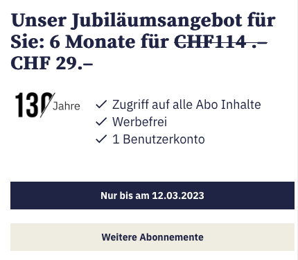 6 Monate Zugriff mit einem Benützerkonto auf alle Artikel Tagesanzeiger.ch für 29.- statt 114.-.