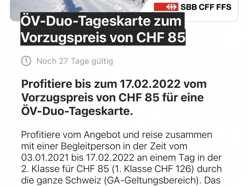 Über die TWINT-APP kann bis 17.02.2020 eine SBB-Duo-Tagekarte bezogen werden.