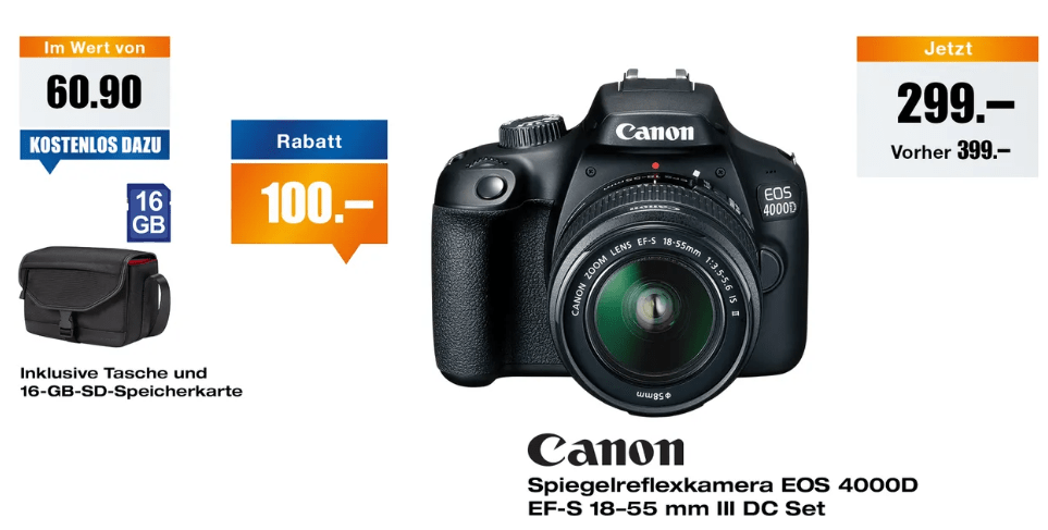 Bei melectronics bekommt ihr gerade die CANON EOS 4000D als Kit mit EF-S 18-55mm, Bag und 16GB Speicherkarte für 299.- CHF.