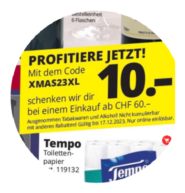Noch ein 10 CHF Gutschein falls ihr alle anderen schon verbraucht habt ;-). Gültig bis 17.12.23 wie immer ohne Alkohol und Tabak ab 60 CHF.