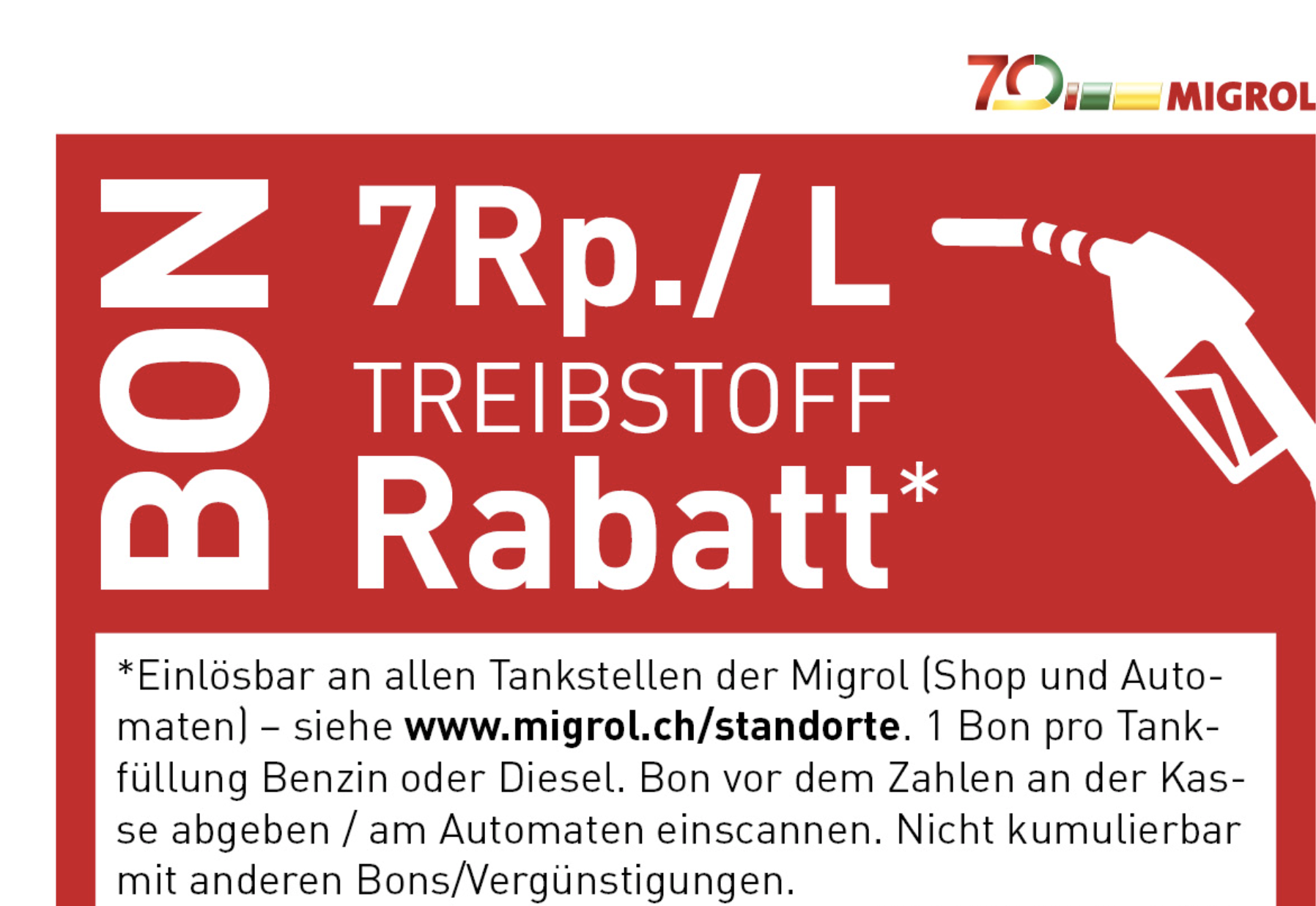 Neuer 5 Rappen pro Liter Rabatt Bon für Treibstoffe bei Migrol