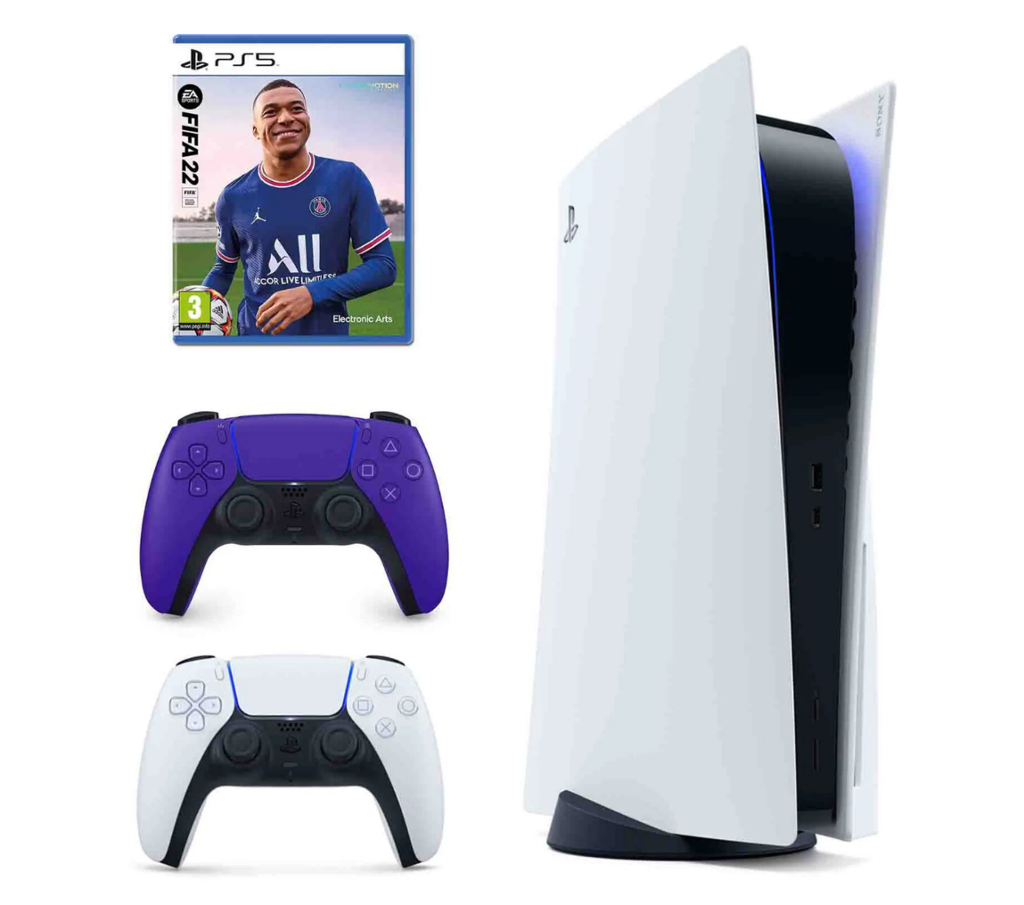 Mit dabei im Bundle sind das Spiel Fifa 22 und ein violetter Controller.