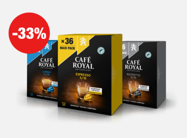 Bei Café Royal gibt’s derzeit wieder 33% Rabatt auf alle Big Packs! Gültig auf alle Big Packs mit je 36, 100 und 180 Kapseln. Nicht mit anderen Aktionen kombinierbar. Solange Vorrat reicht.