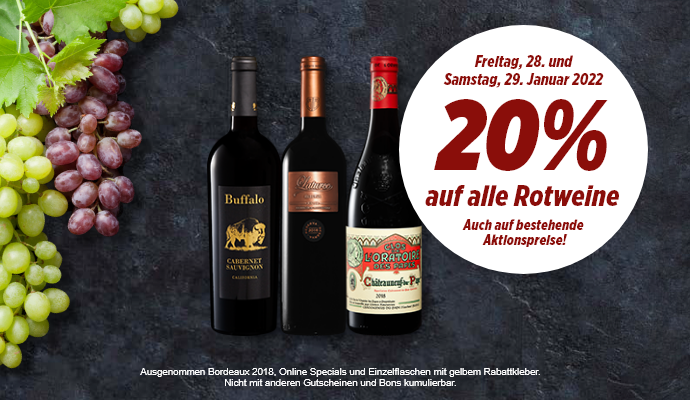 Bei Denner gibt’s am 28.1. und 29.1. 20% Rabatt auf fast alle Rotweine inkl. bereits reduzierte. Einzige Ausnahmen bilden Bordeaux 2018, Online Specials und Einzelflaschen mit gelbem Rabattkleber.