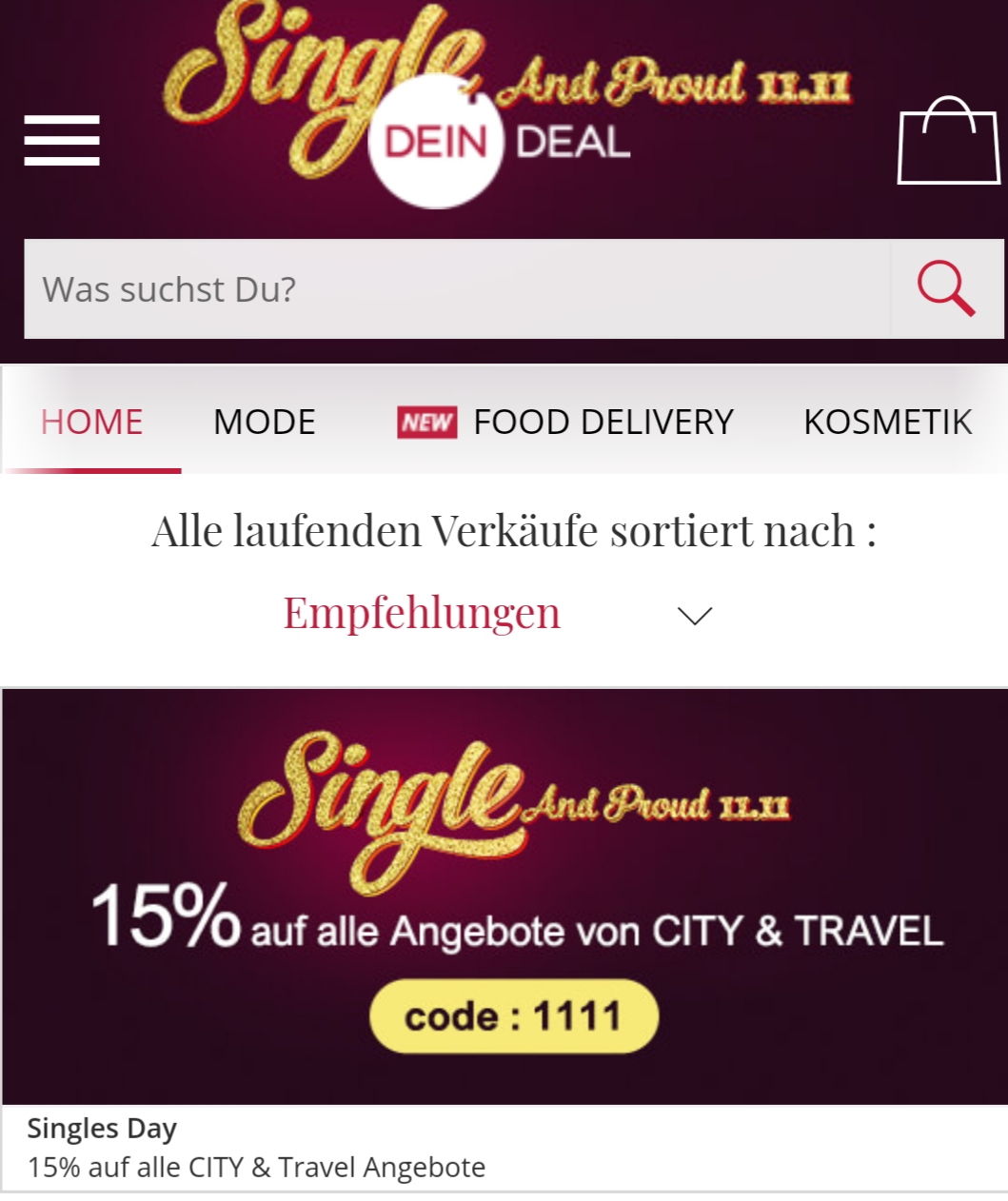 Auf alle Angebote von CITY und TRAVEL gibt es heute zusätzlich 15% Rabatt mit dem Code 1111