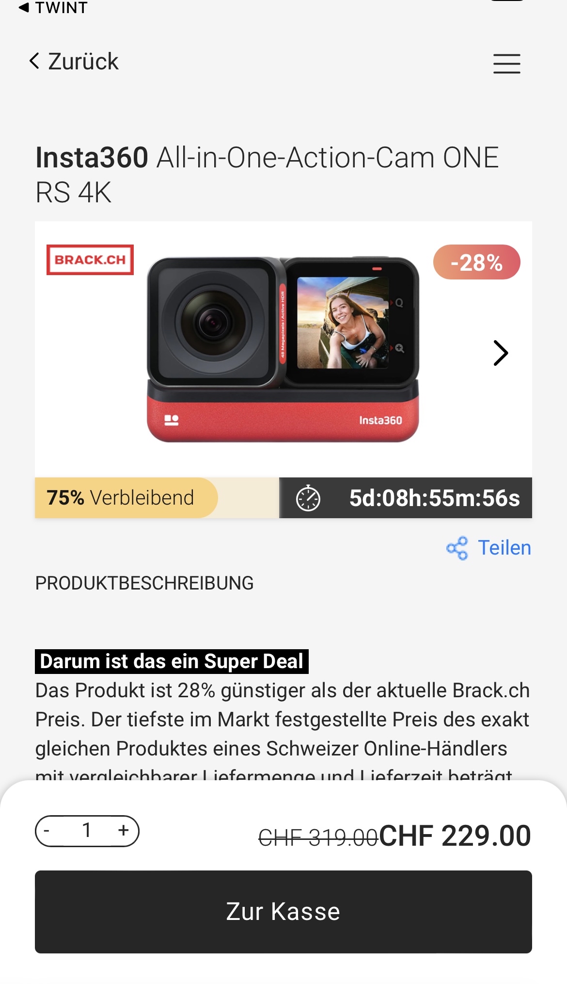 Habe in der TWINT APP die Insta 360 für diesen Super Preis entdeckt. Für mich eine der besten Actioncams die sehr viel Spass macht.