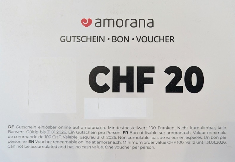 Auf amorana.ch gibt es einen Gutschein über CHF 20. Der Code lautet GIF25. Der Gutschein ist online einlösbar und gilt ab einem Mindestbestellwert von CHF 100. Er ist nicht kumulierbar (kann also nicht mit a […]