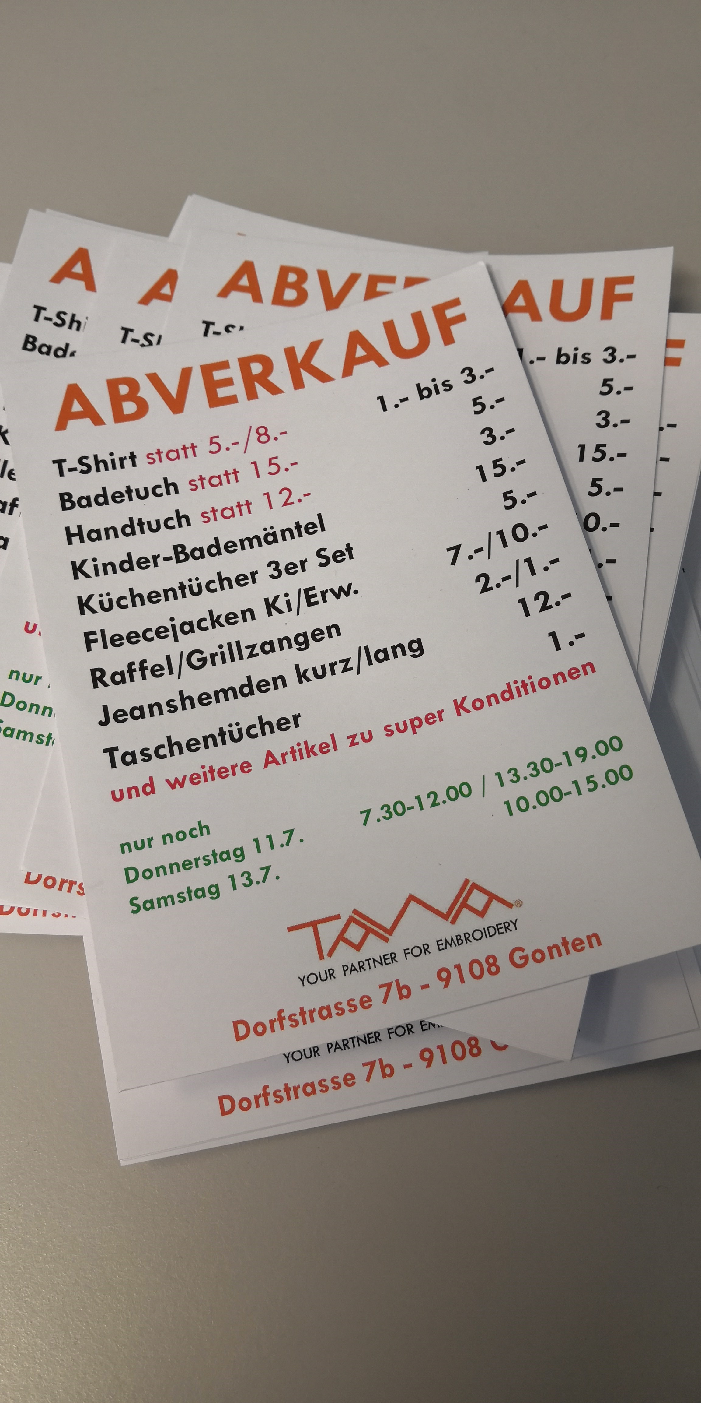Am Samstag gibt es bei der TAWA Albert Weishaupt AG in Gonten einen Abverkauf. Es hat Outdoorjacken mit 60% Rabatt, Frottierwäsche mit bis zu 75% Rabatt und viele weitere Artikel wie Küchentücher, T-Shirts.