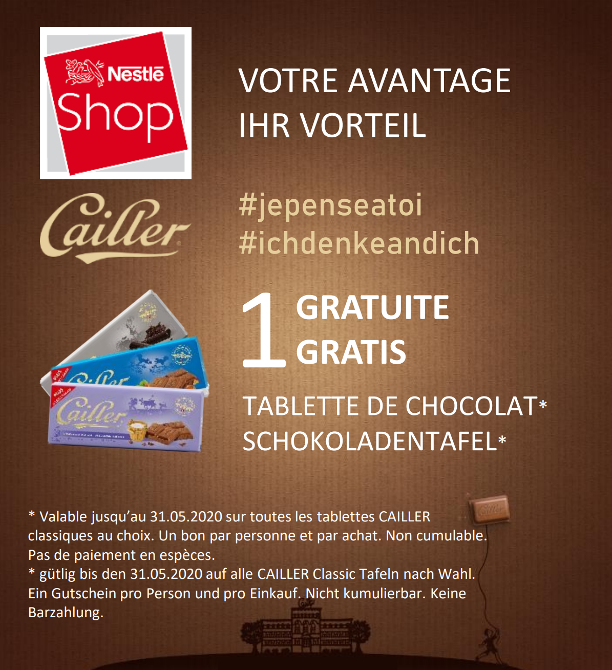 Nachdem die verschickbaren Schoggis von Cailler bereits weg sind, gibt’s nun noch einen PDF-Gutschein, mit welchem man in einem Nestlé Laden eine Cailler Classic nach Wahl abholen kann.