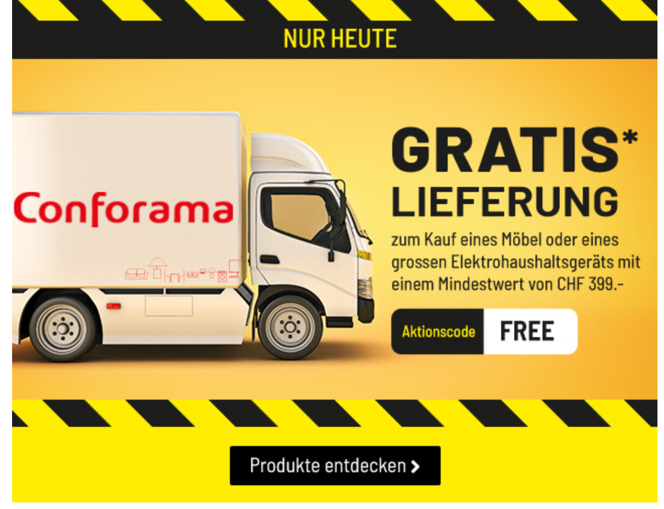Bei Conforama gibt’s mit dem Code FREE heute gratis Lieferung, wenn man ein Möbel für mindestens CHF 399.- bestellt.