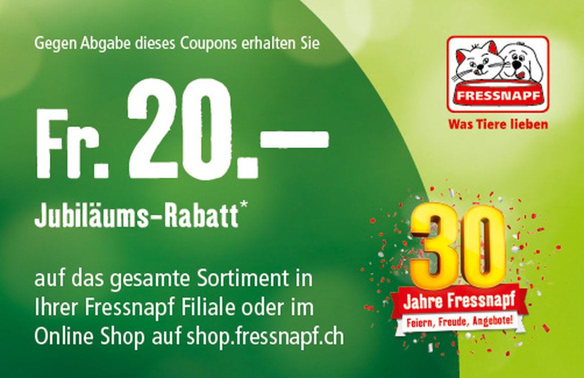 Bei Fressnapf gibt’s zum 30-Jahre Jubiläum einen Gutschein beim Kauf einer Geschenkkarte obendrauf. Die Aktion läuft bis und mit Samstag.