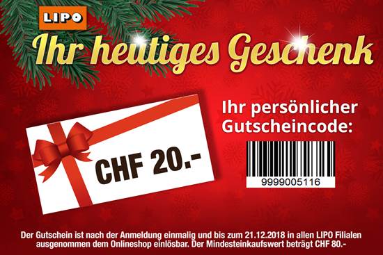 Bei LIPO erhält man heute 20 Franken Rabatt ab einem Einkaufswert von CHF 80.- Gültig nur in den Filialen, nicht im Onlineshop.