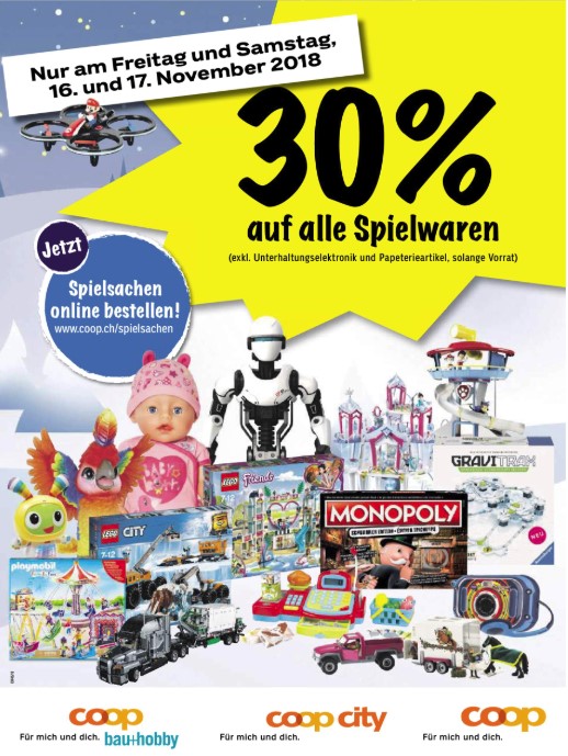 Bei Coop gibt’s am 16. und 17. November (nächsten Freitag & Samstag) 30% Rabatt auf alle Spielwaren. So kann man sich bereits vor dem Black Friday günstig mit Spielsachen als Weihnachtsgeschenk eindecken.