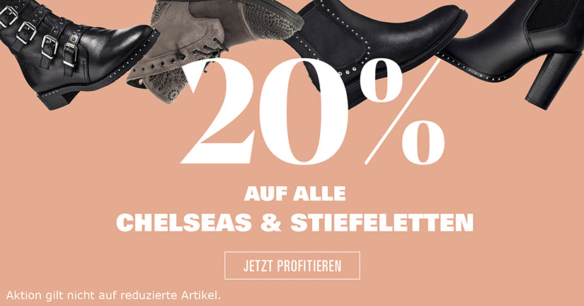 Bei Ochsner Shoes erhält man momentan gerade 20% Rabatt auf Chelseas und Stiefeletten. Ausgenommen sind leider bereits reduzierte Artikel.