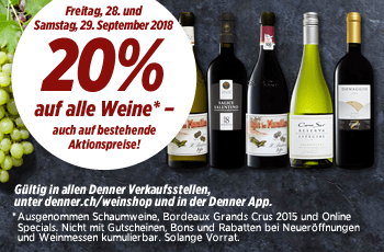 Bei Denner gibt’s diesen Freitag und Samstag 20% zusätzlichen Rabatt auf alle Weine. Auch gültig auf bereits bestehende Aktionen.