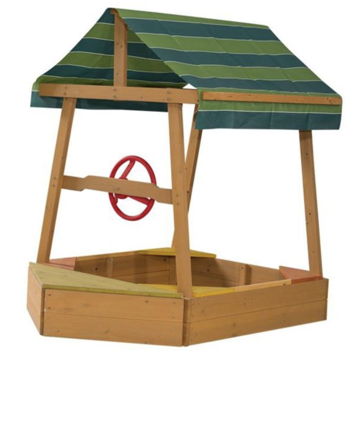 Toller Sandkasten mit Sonnendach. Habe ich bei mir installiert – ist super schön und mega praktisch mit dem Dach, das vor der Sonne schützt.