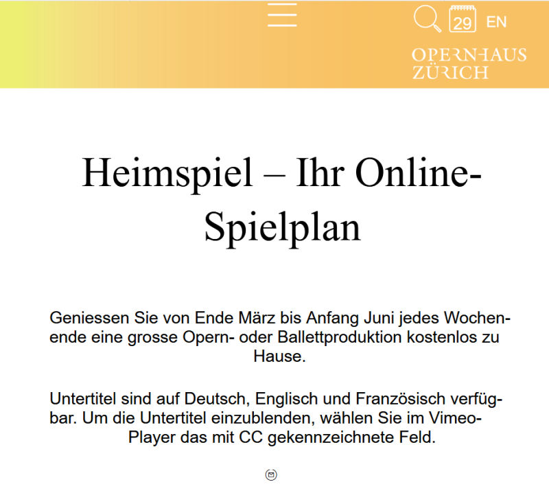 Weil das Opernhaus zu bleibt, stellt es jedes Wochenende per Streaming eine Oper zur Verfügung von Ende März bis 1. Juni 2020.