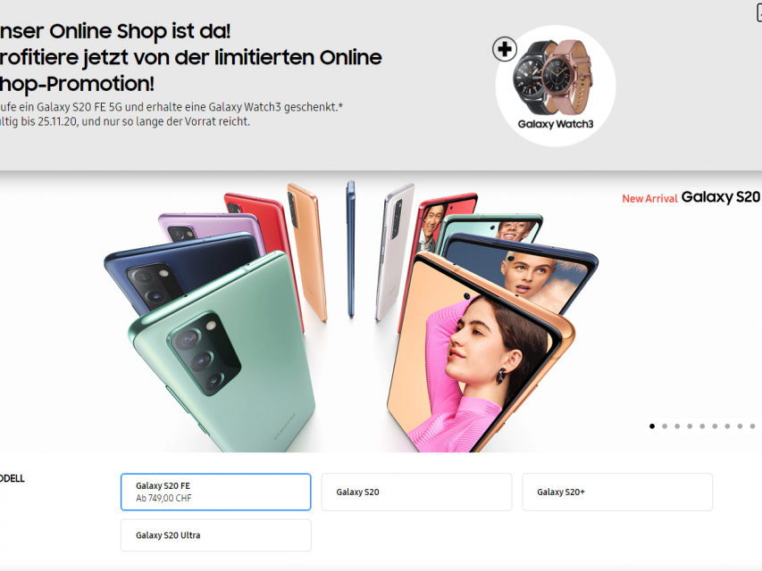 Es gibt momentan zum Start des Onlineshops von Samsung jeweils ein Samsung Galaxy Watch 3 gratis zum Samsung Galaxy s20 FE 5G dazu.