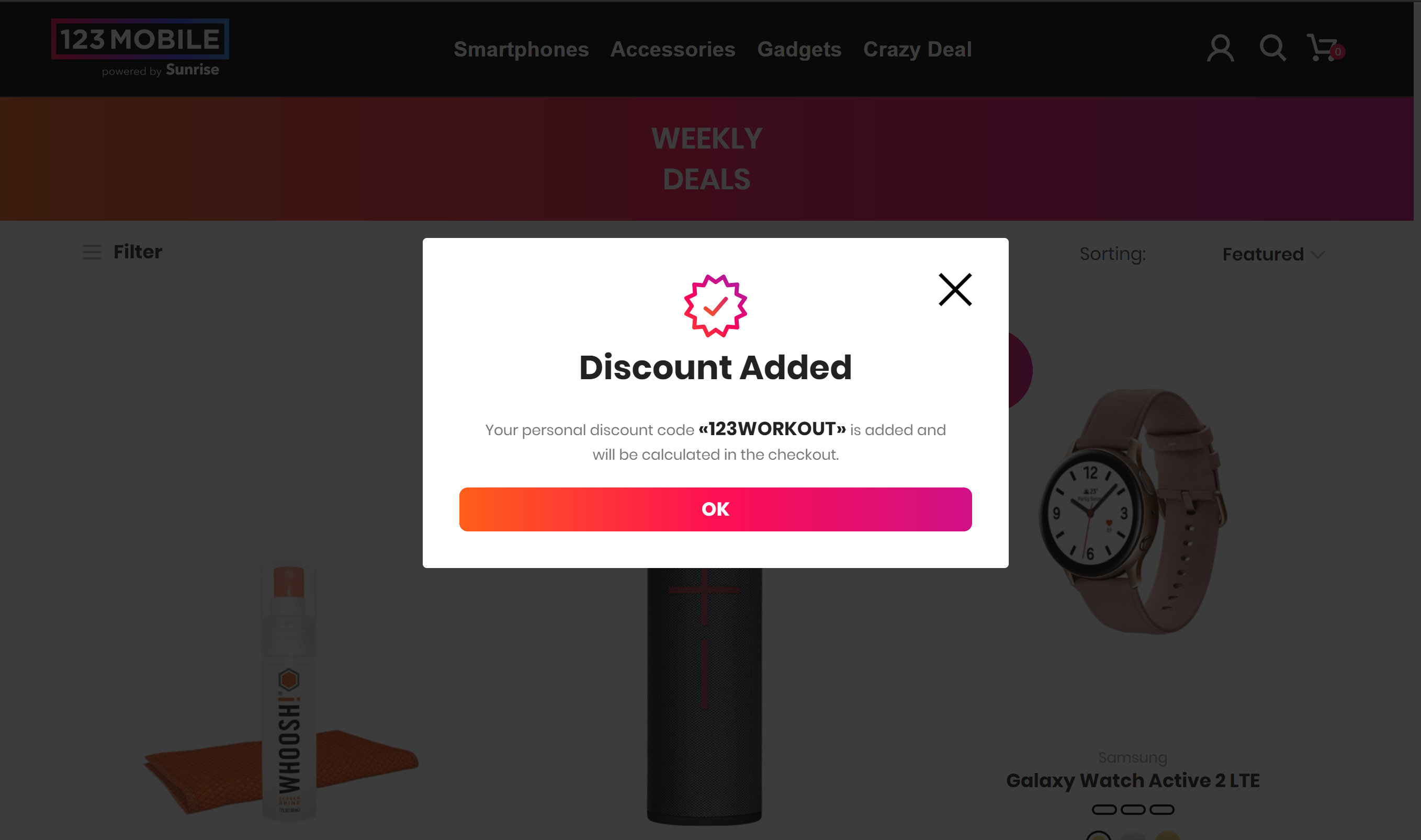 Bei 123mobile.ch gibt es mit dem Gutscheincode 123WORKOUT CHF 10.- Rabatt ab CHF 100.- Bestellwert. Dies gilt auch für bereits reduzierte Ware.