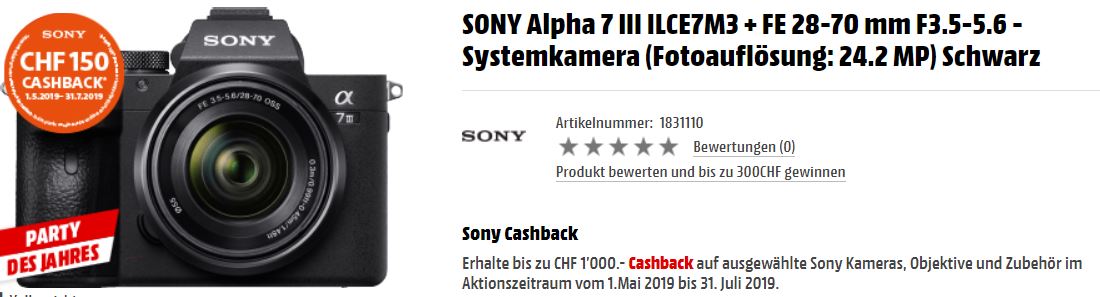Bei Mediamarkt gibt’s gerade die SONY Kompakte Alpha a7 III Black inkl Obkjektiv 28-70mm zum Bestpreis von CHF 1999.-.