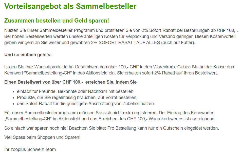 theFippo hat den neuen Beitrag 2% auf alles bei Zooplus ab CHF 100.- geschrieben vor 4 Jahren, 3 Monaten