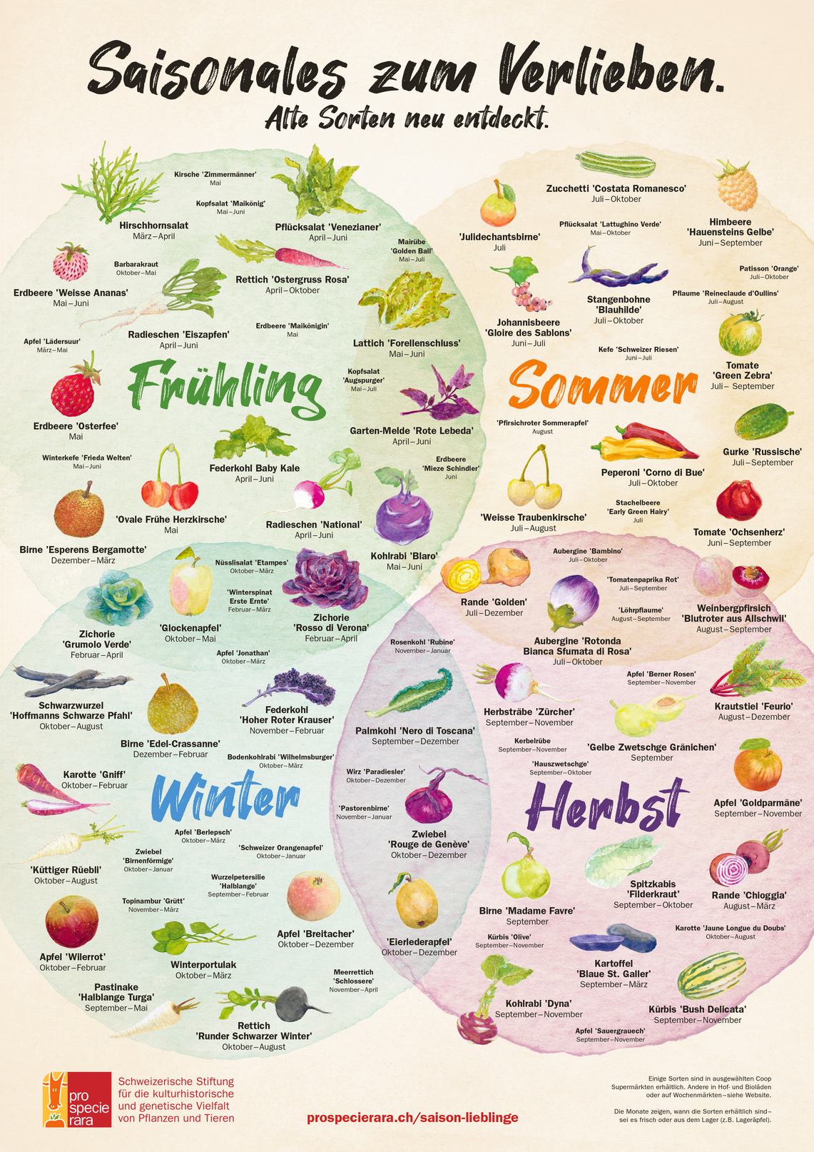 Farbiges Poster mit Saisonübersicht von Gemüse+Früchten von pro specie rara im A2 (420 x 594 mm) Format. Wird offenbar kostenlos angeboten.
