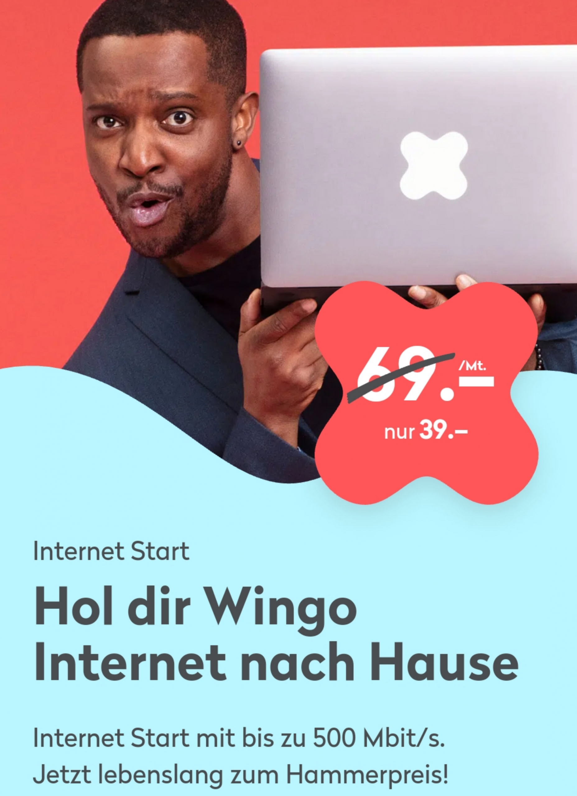 Bei wingo gibt’s noch bis und mit Monat das Internet start mit bis zu 500mbit. Also DSL Kunden ohne Glasfaser. Ohne Laufzeit und lebenslang für 39.00fr.