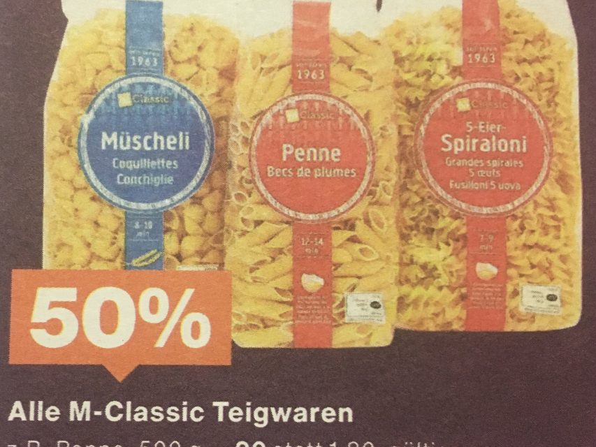 Vom 7.1. bis 10.1.2021 gibt es in der Migros wieder mal 50% auf alle M-Classic Teigwaren - für mich immer ein absolutes Highlight !!! 🤘😋👌