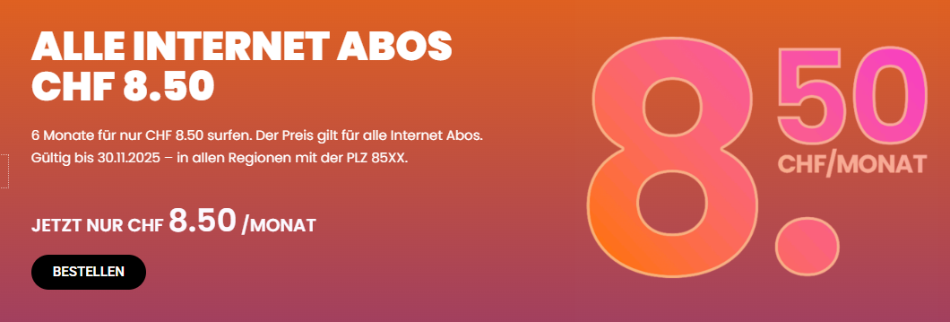 Jedes Internet Abo für CHF 8.50 während 6 Monaten, danach weitere 6 Monate zum vollen Preis. (12Mt. Mindestvertragsdauer)
