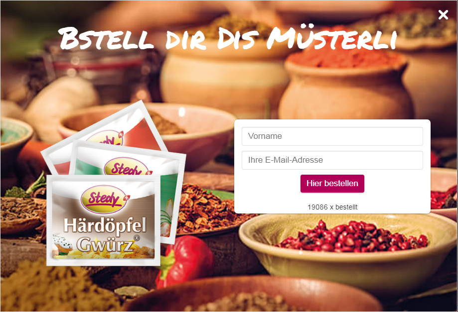 Bei Stedy gibt es momentan drei gratis Müsterli Gewürze. Um das Muster zu erhalten muss man erst nach unten scrollen, bis das Fenster kommt.