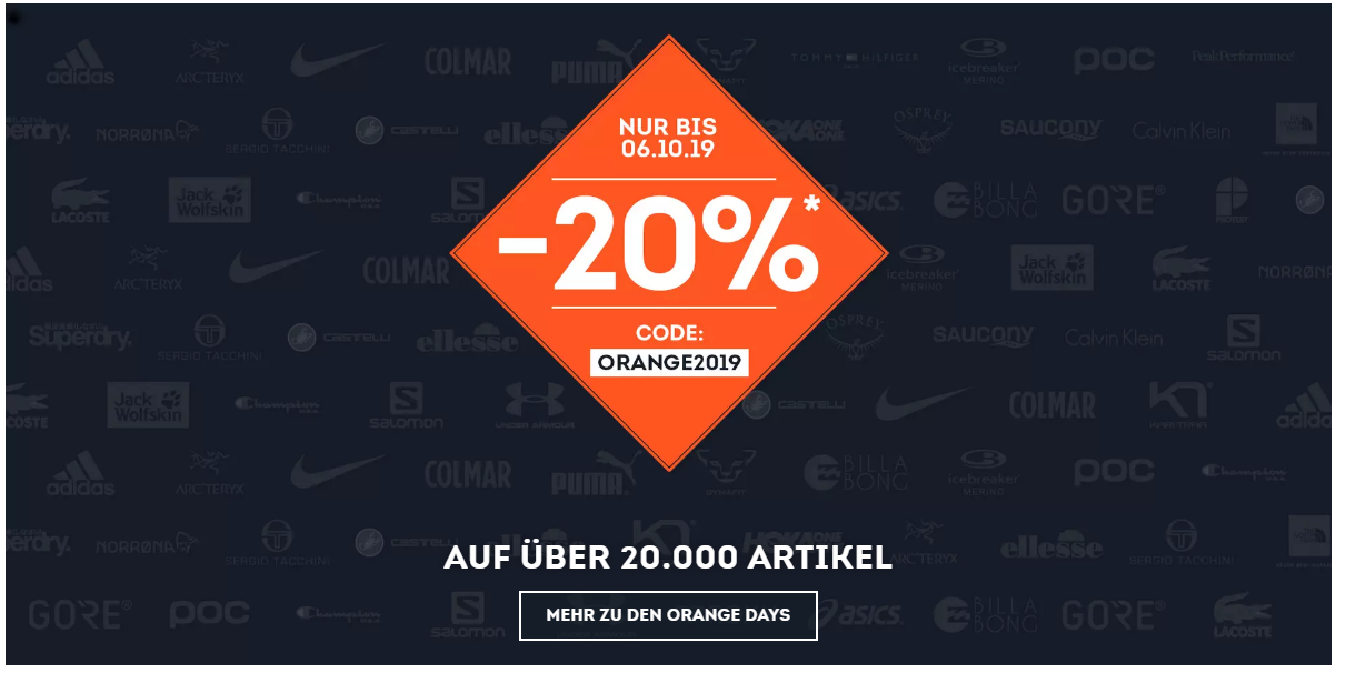 Bei Sportscheck sind bis zum 06.10. die Orange Days. Mit dem Gutscheincode ORANGE2019 kann man bei mehr als 23.000 Artikeln 20% sparen. Ausgenommen sind Elektronik-Artikel.