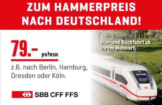 Bei Interdiscount gibt es bis zum 24.11. ein tolles Angebot. Für CHF 79.- erhält man die HIn- und Rückfahrt nach Deutschland (z.B. Berlin, Hamburg, Köln…).