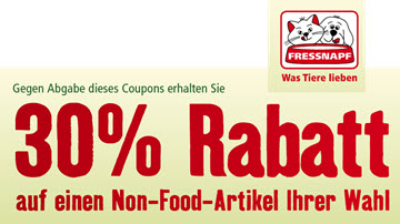 In den Filialen von Fressnapf kann bis zum 22.5.2019 mit dem ausgedruckten Gutschein ein Nonfood-Artikel nach Wahl mit 30% Rabatt bezogen werden.