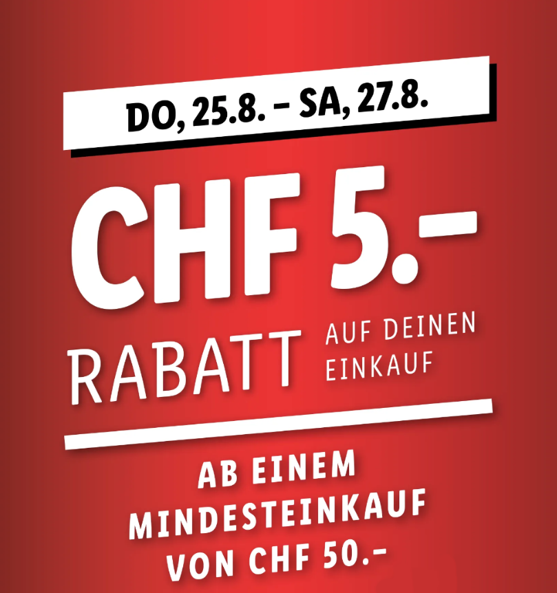 Bei Lidl profitiert ihr nur ab morgen bis am Samstag, dem 27.08. von einem Gutschein für 5 Franken Rabatt ab 50 Franken Bestellwert.