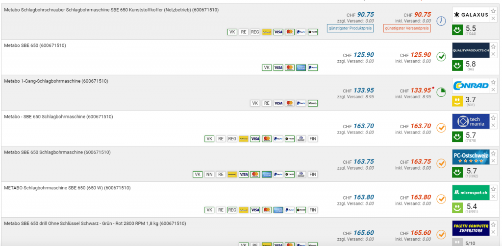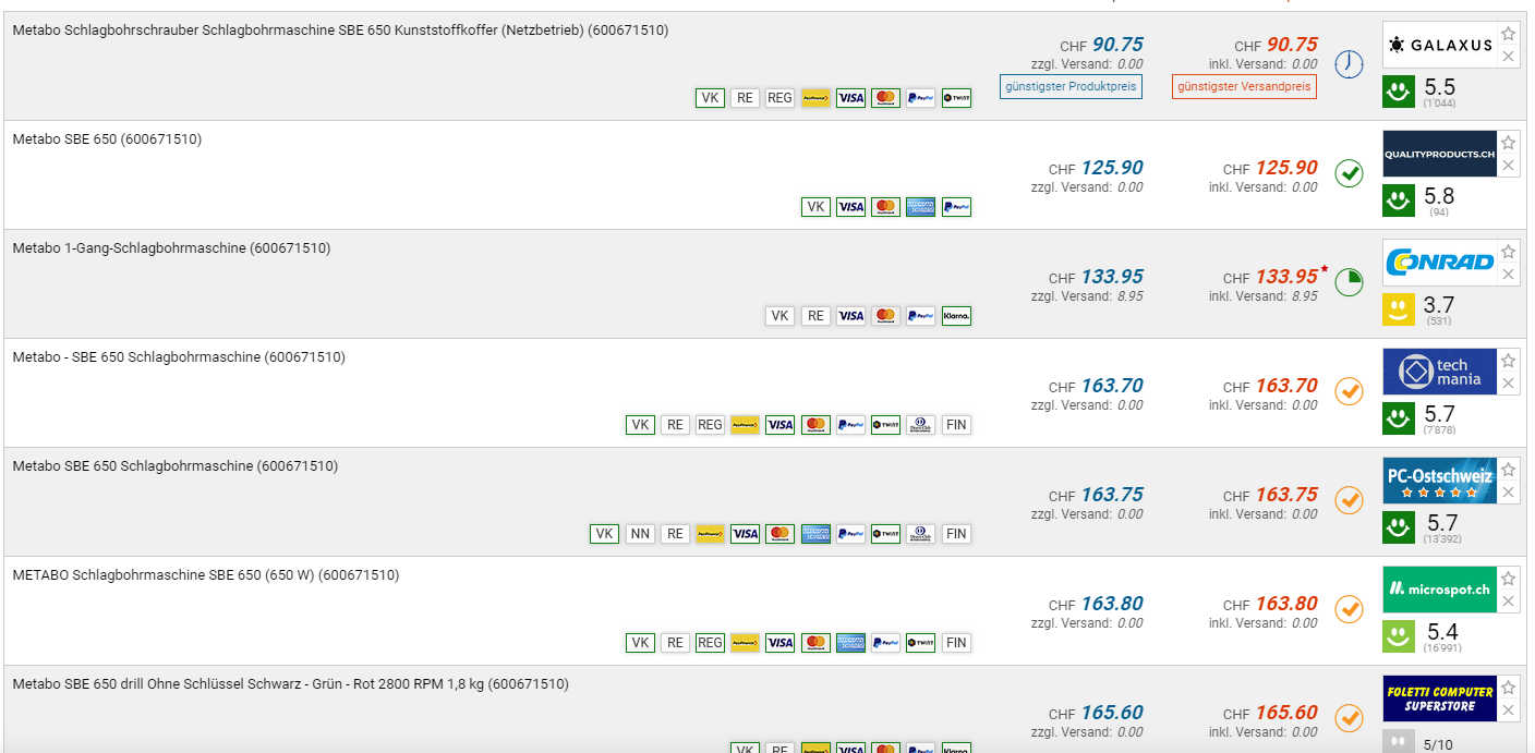 Bei galaxus gibt es momentan den Metabo Schlagbohrmaschine SBE 650 für den Bestpreis von CHF 90.75. Seit einigen Tagen schwankt der Preis bei galaxus um die CHF 90. Zuletzt war der Preis im Mai 2018 so tief. Der vorherige Bestpreis war CHF 90.-. Der zweitbeste Preis beträgt CHF 125.90.