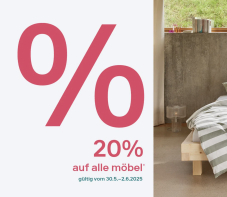 *Gültig vom 30.5. – 2.6.2025 auf alle Möbel in allen micasa-Filialen und im Online-Shop. Ausgenommen sind bereits reduzierte Artikel, das RELOVED-Sortiment sowie die Limited Edition-Kollektionen. Nicht kumulierbar mit anderen Aktionen oder Rabatten. Der Preisvorteil gilt nur bei Neuaufträgen. Solange Vorrat.